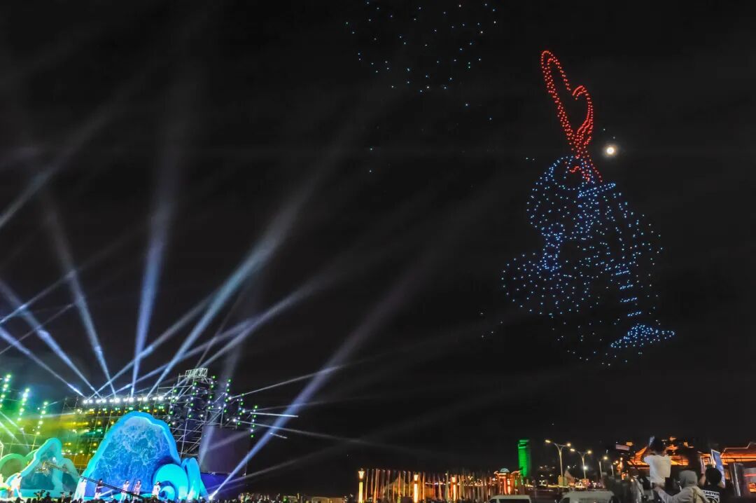 本屆旅游發(fā)展大會(huì)開幕式上,無(wú)人機(jī)矩陣秀表演將紫色葡萄酒高高舉起,在柔和的月光下,以傳承百年的葡酒文化為“媒”,盛邀五湖四海的賓朋舉杯與煙臺(tái)同醉。