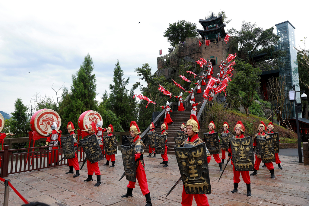 開園當(dāng)天,一場(chǎng)復(fù)原宋元時(shí)期戍城儀式的 “開城儀式” 在磐石城上演。身披鎧甲的“守城將士”持戟列陣,在雄渾號(hào)角聲中緩緩?fù)崎_寨門。游客手持“通關(guān)文牒”,化身宋時(shí)旅人,參與“宋代女俠比武”“背誦《磐石城記》”“蒙眼摸景”等一系列趣味互動(dòng)任務(wù)。