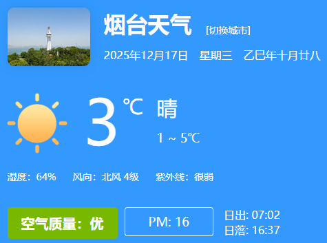 12月17日煙臺天氣:晴 1 ~ 5℃ 北風 4級